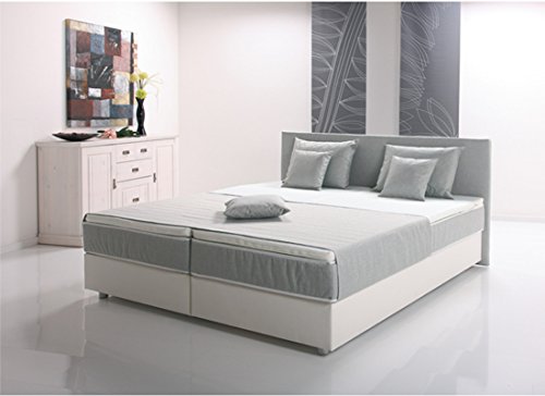 Boxspringbett inklusive Topper mit glatt gepolstertem Kopfteil in Möbelstoff hellgrau. Unterbau mit Schaumpolsterung in pflegeleichten Kunstleder. Aufliegende 4-Gang-Bonnellfederkernmatratze (Härtegrad 2) mit Spiegel aus Drellbezug für optimalen Feuchtigkeitstransport. Bezugsstoffe aus schmutzresistenten Möbelstoffbezug (Merlin Magic). Liegefläche und Unterbau 2-geteilt. Sitz-/Liegehöhe ca. 50 cm. Inkl. Topper (180x200cm) aus 4cm Comfortschaum mit 4-Seiten-Reißverschluss, Bezug waschbar bei 60°C. Dekomaterial nicht im Lieferumfang. Lieferzeit ca. 4-6 Wochen. Maße ca.: Liegefläche 180×200 cm – Stellfläche Breite 190 cm, Länge 208 cm Kopfteilhöhe ca. 97 cm Sitz-/Liegehöhe ca. 50 cm -Bitte teilen Sie uns nach Kauf, zwecks Lieferterminabstimmung, Ihre Telefonnummer mit –